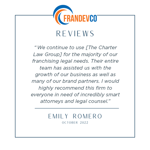Not only that, but we have the unique experience of growing, building and selling franchises—because we’ve been there before. As founders and in-house counsel for numerous franchise brands, we bring a unique perspective to the legal and operational needs of your franchise organization in all stages of your journey. Let Charter Law be your guide, giving you all the tools and support you need to take your business to the next level with complete confidence.